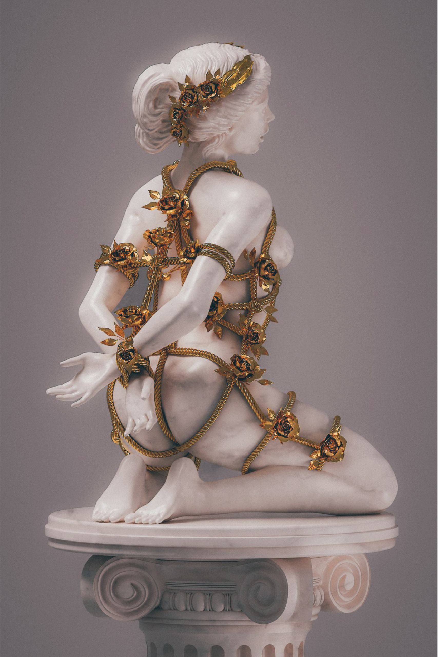 Those elements were already present in classical art—satyrs, abductions, and the many stories of desire and power in Greek mythology. Classical imagery is full of these dynamics. My work connects that legacy with shibari, a Japanese practice that evolved from a method of restraint into a contemporary art form.